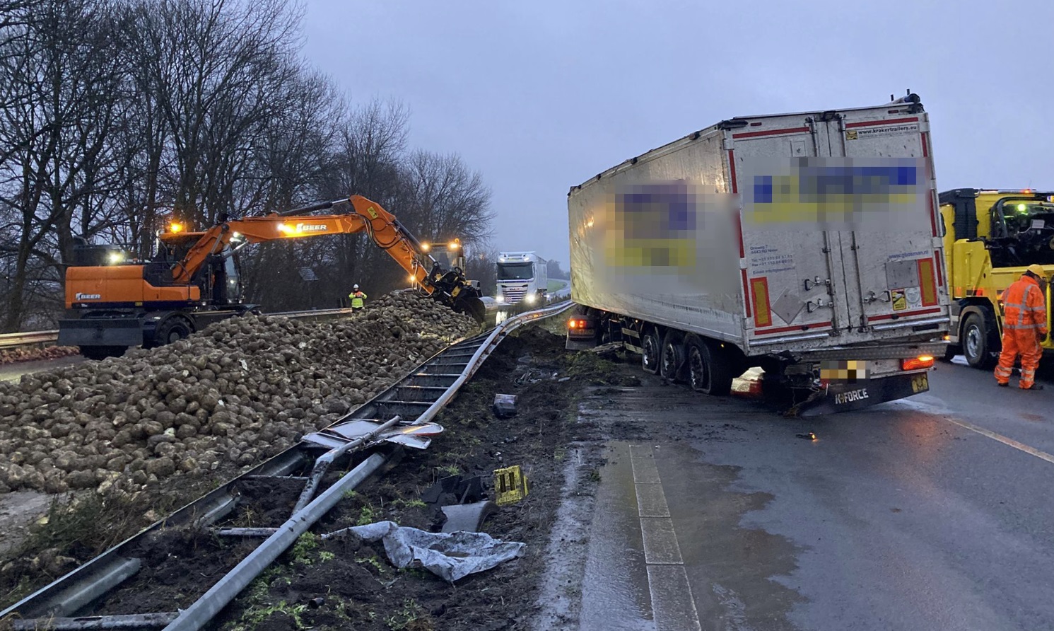 De snelweg A17 bij Roosendaal is dicht vanwege een ongeval. Een vrachtwagen met suikerbieten is daar gekanteld. De lading bieten is daarbij op de rijbaan terechtgekomen.