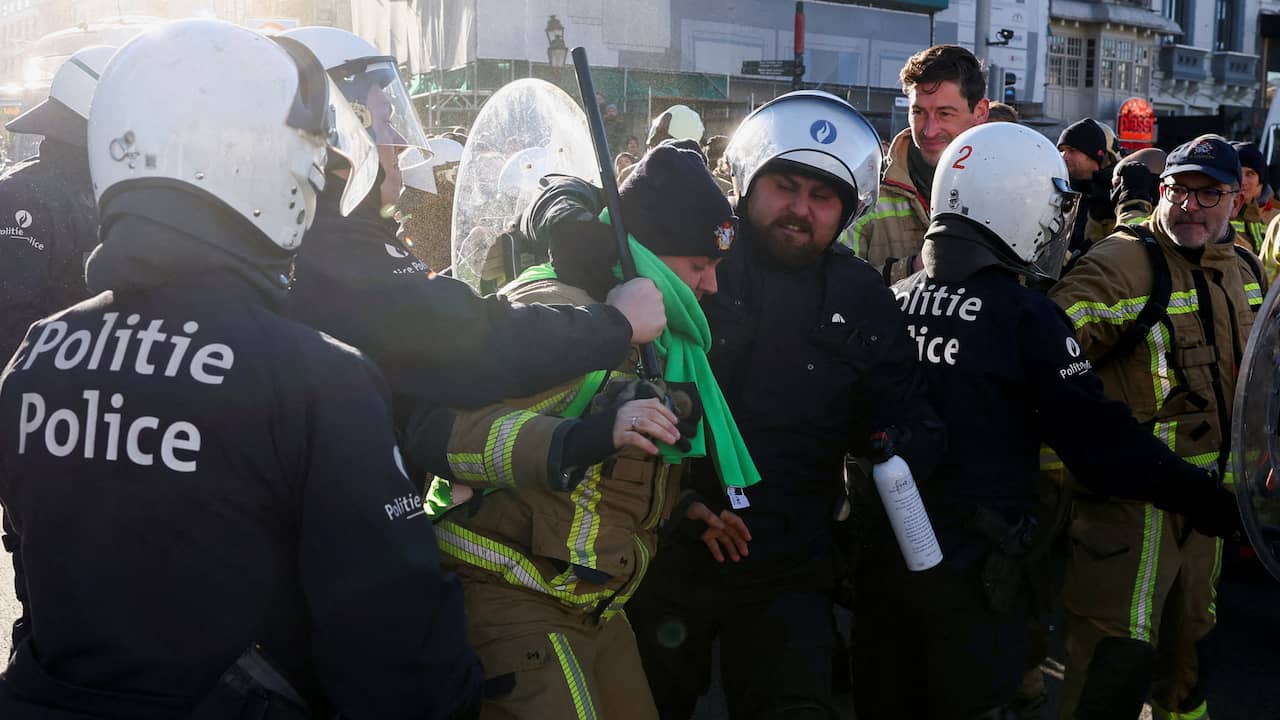 In Brussel zijn agenten aangevallen door tientallen stakende brandweerlieden. Meerdere agenten raakten daarbij gewond. In België wordt maandag geprotesteerd tegen de pensioenplannen van de regering.
