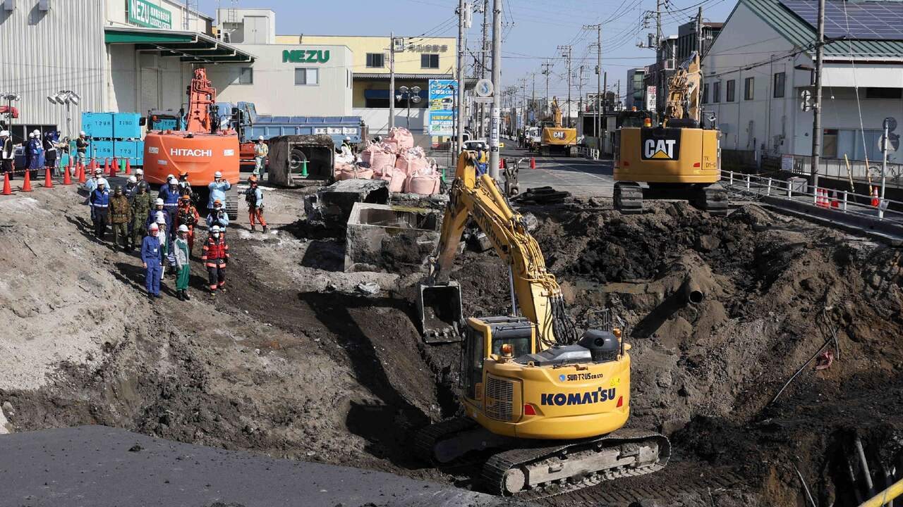 De zinkgat, die afgelopen dinsdag een vrachtwagen met bestuurder opslokte, in Japan groeit. De autoriteiten roepen omwonenden daarom op om te evacueren en minder water te gebruiken.